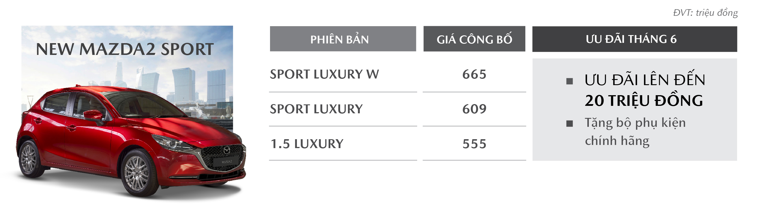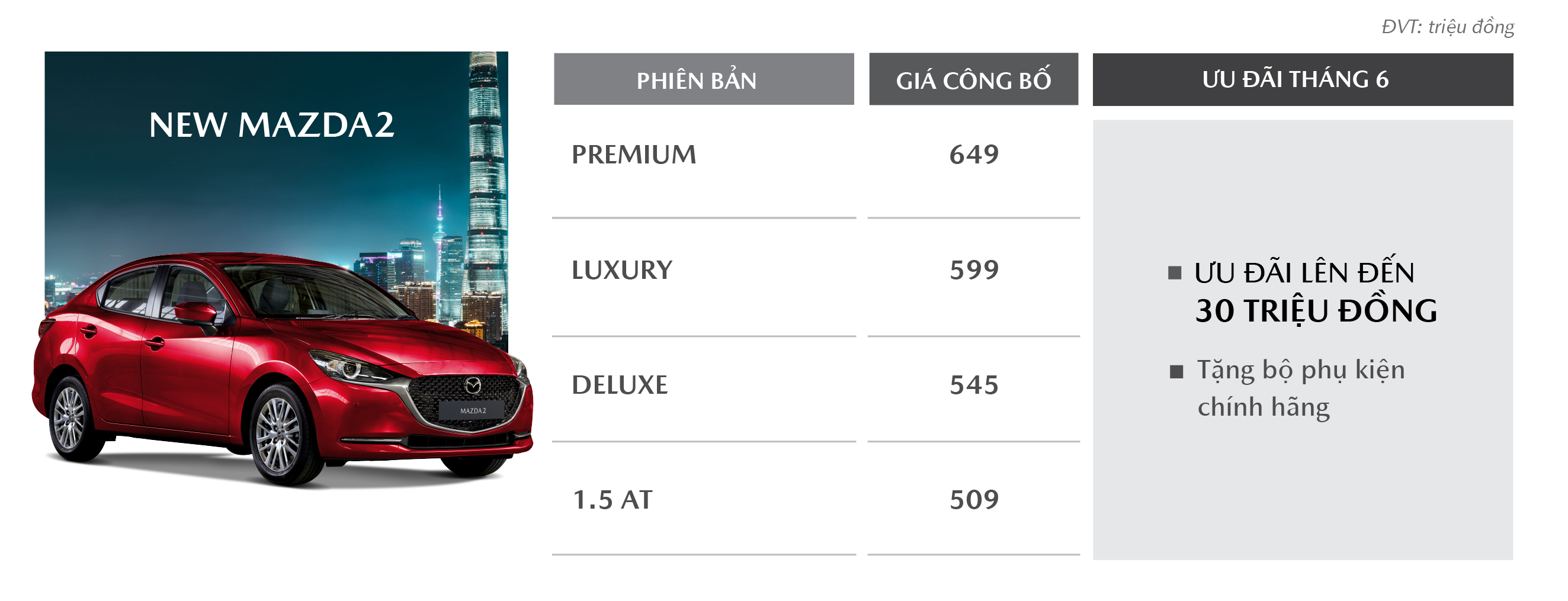 Hai mẫu xe vừa ra mắt vào tháng 03/2020 là New Mazda2 và New Mazda2 Sport nhận gói ưu đãi lên đến 40 triệu đồng. Trong đó, tất cả các phiên bản New Mazda2 được giảm giá trực tiếp 30 triệu đồng đi kèm gói phụ kiện chính hãng trị giá 10 triệu đồng (tùy phiên bản); toàn bộ các phiên bản New Mazda2 Sport giảm giá trực tiếp 20 triệu đồng đi kèm gói phụ kiện chính hãng trị giá 8 triệu đồng.
