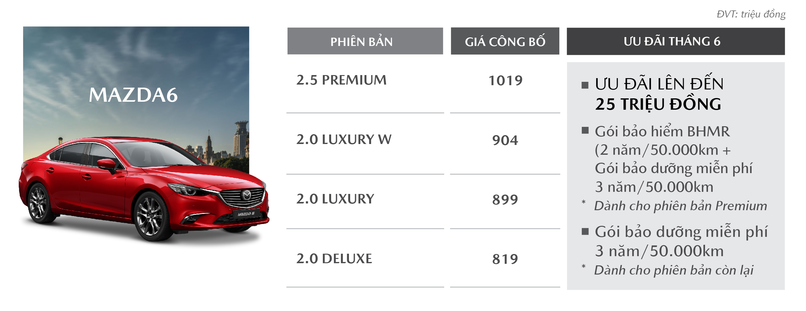 Gói ưu đãi mua xe Mazda6 lên đến 85 triệu đồng bao gồm trừ trực tiếp 25 triệu đồng tiền mặt vào giá bán, tặng kèm gói bảo dưỡng trị giá 20 triệu, gói bảo hiểm bảo hành mở rộng 20 triệu và gói phụ kiện chính hãng 20 triệu đồng (tùy phiên bản)